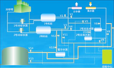 白天用電高峰時段(電價高):空調主機停機,開啟融冰泵將蓄冰罐中的冰水送到空調末端,供用戶使用。系統組成